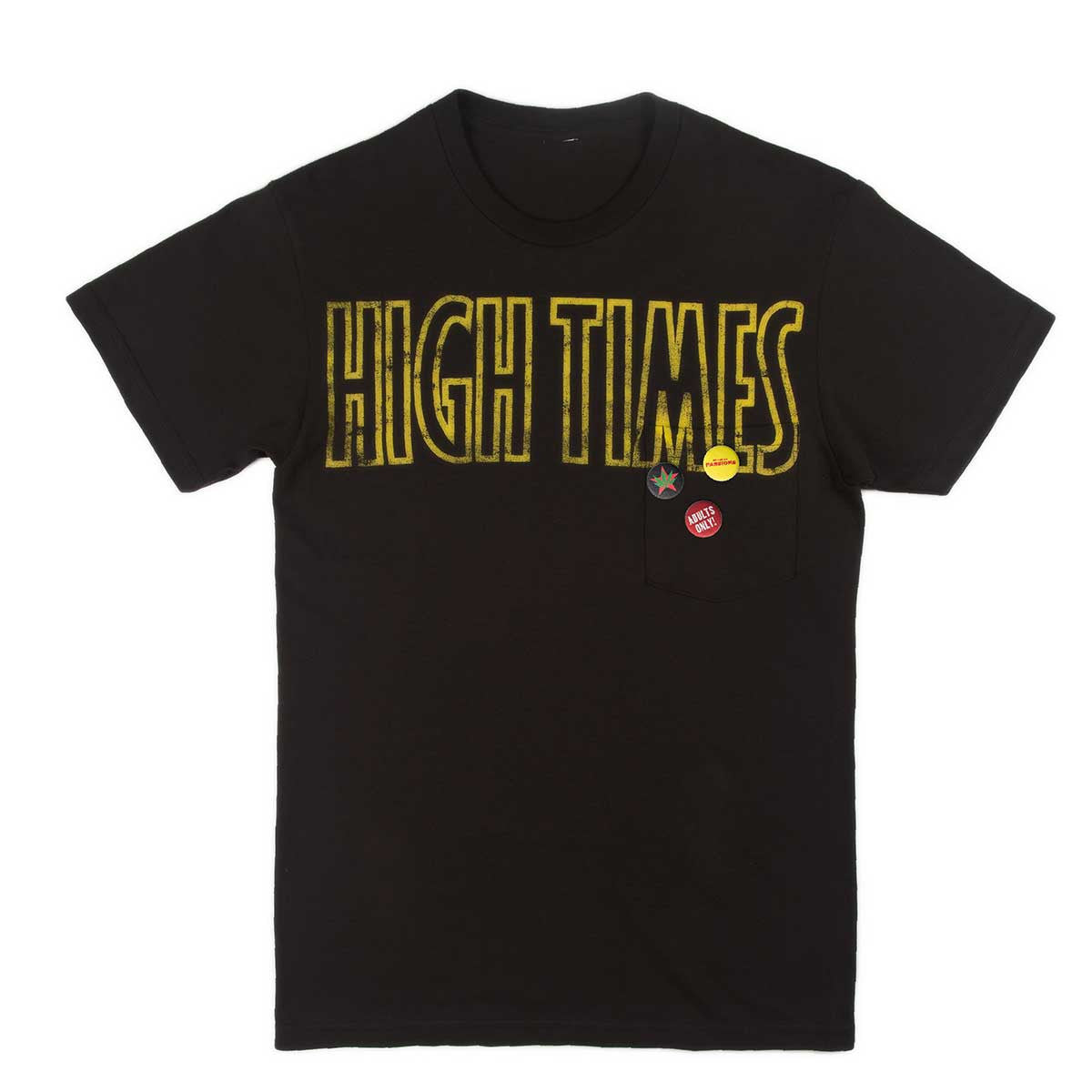 Our first collection celebrates the Reefer Madness' absurdity of the 1900's with a HIGH TIMES. branded cotton short sleeved T-shirt with seamless rib knit collar in black.